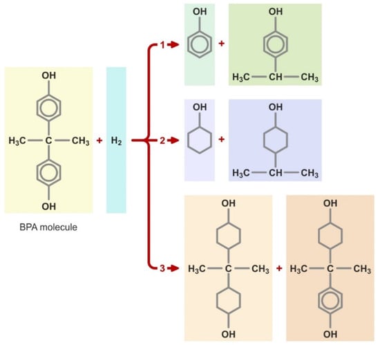 BPA can undergo various chemical reactions, e.g., hydrogenation, coupling, nitrosation, alkylation, nitration or esterification. In some cases, different final products may be formed, depending on process conditions and the type of reaction. The hydrogenation reaction of BPA, which can be carried out using three different pathways (Figure 2), is an example of this phenomenon. The first hydrogenation pathway results in the formation of phenol and p-isopropylphenol, and the second yields cyclohexanol and p-isopropylphenol, whereas the third yields 2,2-bis-(4′-hydroxycyclohexyl)propane as well as 2(4′-hydroxycyclohexyl)-2-(4″-hydroxyphenyl)propane [].