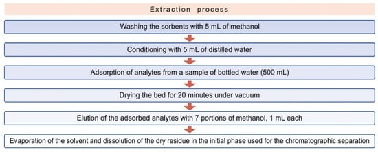 A total of 500 mL of the bottled water samples A, B, C, D and E, respectively, were subjected to solid phase extraction. The extraction process consisted of the following steps (Figure 3):
