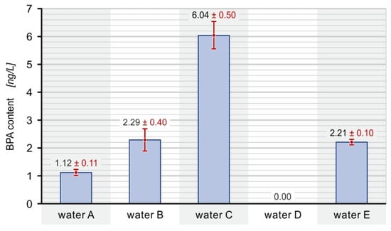 Bisphenol A was detected in all water samples, except for water D. Its highest concentration was determined in water C. The obtained values correspond well with the values found in the literature, ranging from 4.04 ng/L [] to 4.6 ng/L []. There are several aspects that may be the cause of the differences in the content of BPA in the tested samples, e.g., the material of the bottle, the material of the cap, the method of storage at the stages of production and sale, and the materials of the installation used to draw water and fill the bottles.