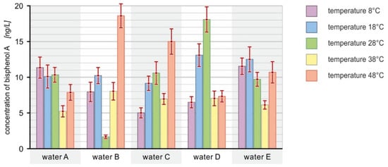 In the case of water A, it was observed that the highest concentration occurred at the temperature of 8 °C (11.30 ng/L). At the temperatures of 18 and 28 °C, the amount of bisphenol A in the water remained at a similar level (approx. 10.3 ng/L). The lowest concentration, namely 5.19 ng/L, occurred at the temperature of 38 °C. After the water was exposed to the temperature of 48 °C, an increase in the concentration of bisphenol to the level of 7.84 ng/L was observed.