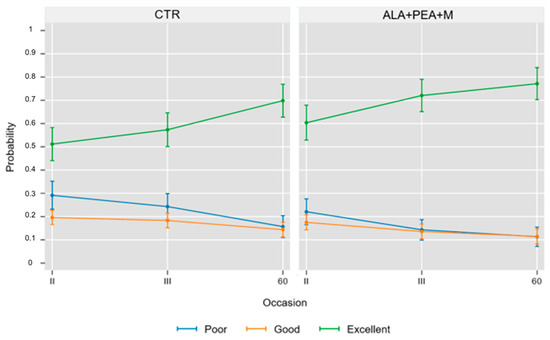 Time-related changes in the proportion of patients with a poor, good, and excellent outcome in the control O2-O3 (CTR) and O2-O3 + ALA (ALA) groups. Values are proportions and 95% cluster confidence intervals from ordinal logistic regression (see statistical analysis for details).