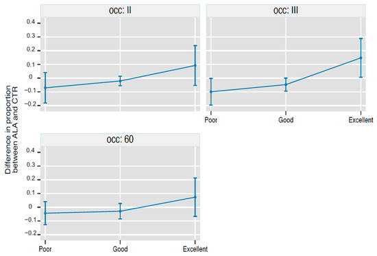 Between-group (control O2-O3 group and O2-O3 + ALA group) difference in the proportion of patients with a poor, good, and excellent outcome during the study after 2nd treatment (OCC: II), after 3rd treatment (OCC: III), and at the clinical check-up conducted 60 days ± 8 from the end of the treatment (OCC: 60). Values are proportions and 95% cluster confidence intervals from ordinal logistic regression with Bonferroni correction for 9 contrasts. Points whose 95% CI do not cross the 0 line, i.e., all points at occasion III, are significant at p-level < 0.05 (see statistical analysis for details).
