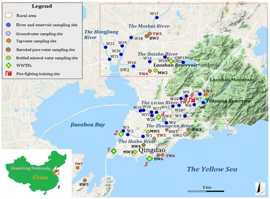 Qingdao, a large coastal city in North China, may represent an interesting case study to investigate the occurrence and exposure of PFASs along the rural–urban environmental and socioeconomic gradients. The tap water in Qingdao City is a mixed water from several raw water sources. In this study, the contamination level of the PFASs in river water; drinking water sources (reservoirs and groundwater); and in various types of drinking water (tap water, barreled pure water, and bottled mineral water) from Qingdao were investigated. The objective was to assess the impact of PFAS contamination in surface water on drinking water and human health. The mass loading of PFASs in the rivers and human risk via the route of the drinking water were also discussed.