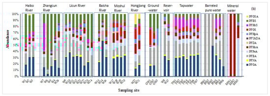 (a) Concentrations and (b) composition profiles of PFASs in different water matrices in Qingdao.