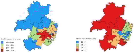 Crash frequency and the median crash duration of SA3. The zonal shapefile of SA3 was downloaded from the Australian Bureau of Statistics []. The original shapefile covered the entire state of New South Wales in Australia. Therefore, we trimmed the shapefile to restrict it to our study area, i.e., Sydney. Then we visualise our processed data (crash frequency and duration) spatially.