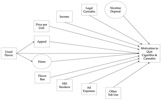 After finalizing the measurement model based on assessment of fit (Comparative Fit Index (CFI) and Tucker–Lewis Index (TLI) ≥ 0.95 [], RMSEA estimate ≤ 0.06, and upper 90% confidence limit ≤ 0.06 [], and standardized root mean squared residual (SRMR) ≤ 0.08 []) and any necessary theoretically acceptable modifications, we assessed measurement invariance based on gender identity and race/ethnicity to determine whether statistical models should be run separately []. We removed items with non-significant standardized factor loadings of <0.40 or coefficients of determination (R2) of <0.50, which may suggest that item is not a good indicator of the latent construct []. In the structural models (two separate SEMs were run for motivation to quit cigarillos and motivation to quit cannabis), we removed non-significant correlations from the model, if doing so did not conflict with theory. Alternative models were compared: indirect effects from usual flavored cigarillo use to motivation to quit through perceived harm and appeal (originally hypothesized model; Figure 1), indirect effects through only one pathway (harm or appeal), and no indirect effects.