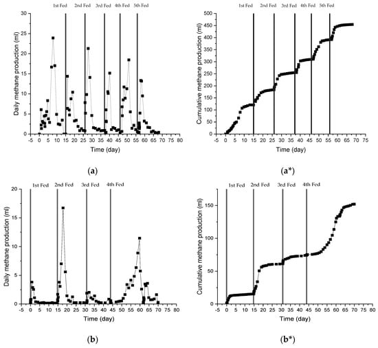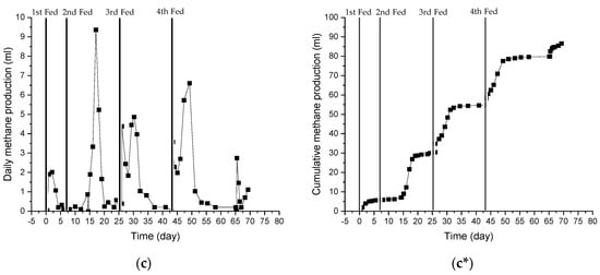 Daily (without *) and cumulative (with *) methane production of anaerobic sludge at (a,a*) 42 °C, (b,b*) shifted-up to 45 °C, and (c,c*) shifted-up to 48 °C.