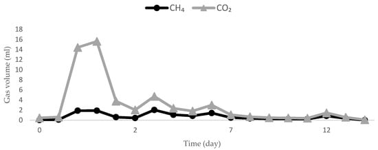 The fluctuation in daily CH4 production and cumulative CH4 production during the first incubation at 42 °C is shown in Figure 1. During the batch anaerobic digestion period, biogas production increased gradually with the cumulative volume of biogas generated being up to 316.5 mL on day 14, with cumulative CH4 production being up to 120.76 mL CH4. The CH4 content in the biogas increased rapidly in the first 8 days, reaching 69% on the 8th day, and 64.7% on average until day 13. Cumulative CH4 production increased gradually in the first 3 days, and then showed a substantial increase on day 7 (66.59 mL CH4). On the final day of the batch period, the cumulative methane production reached 120.76 mL CH4 which was equal to 1.43 L·g−1 COD feed. Theoretically, the energy recovery (expressed as CH4 production) from digested wastewater sludge through anaerobic process was 0.38 L·g−1 COD []. From this study, it took approximately four days of anaerobic digestion to exceed the theoretical CH4 production with the aforementioned inoculum and substrates, with an I·S−1 ratio of 2.75.