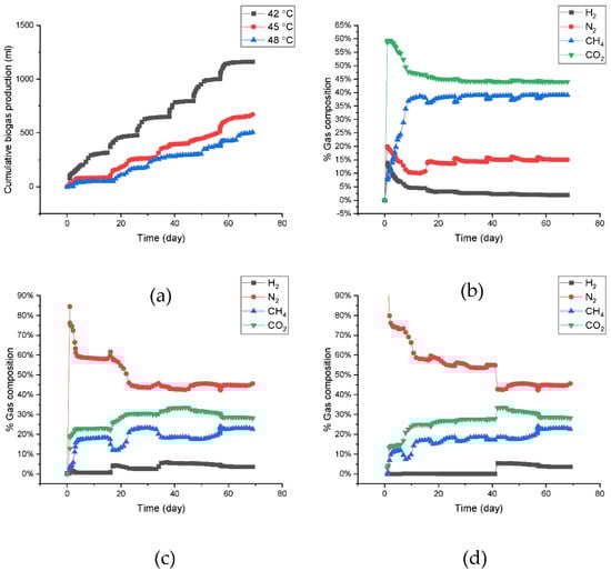 Total biogas production (H2, N2, CH4, and CO2) of anaerobic sludge during the shifted-up temperature conditions (a) and biogas composition at 42 °C (b), shifted-up to 45 °C (c), and shifted-up to 48 °C (d).