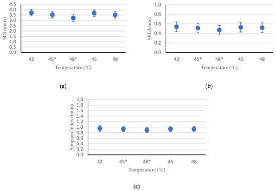To study the changes in microbial diversity at the upshift temperature, samples from the reactor were used for DNA isolation for bioinformatic analysis using NGS. For comparison, several samples from other fed-batch reactors with controlled temperatures of 42 °C, 45 °C, and 48 °C were examined for their microbial diversity. This action was intended to elucidate the differences among microbial communities and compositions that matured under controlled and shifted-up temperatures. The Shannon diversity index (SDI) and Simpson index were used to measure and compare the richness of the microbiota at a certain temperature, while the Shannon equitability index (SEI) was assigned to approximate the evenness of the microbiota diversity.