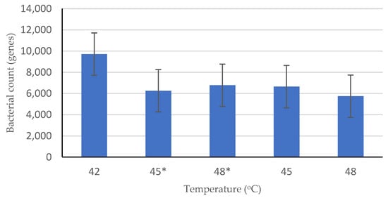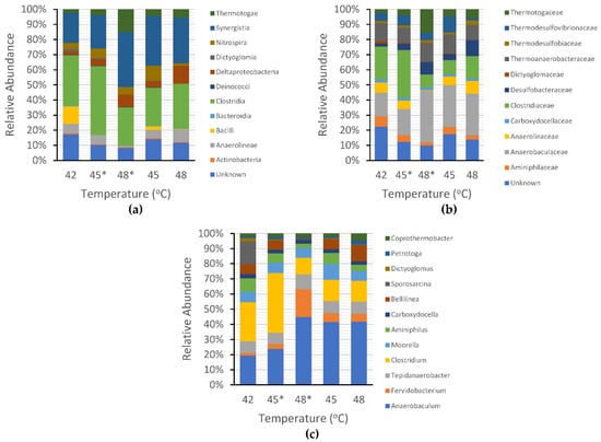 As illustrated by Figure 4a,b, the index value for both richness and evenness of the microbiota communities spread within the range 3.2–3.7 and 0.46–0.54, respectively. The Simpson index, as seen in Figure 4c, ranged from 0.89 to 0.96, indicating high diversity for all sample conditions. The deviation of the diversity index between the shifted-up temperature conditions and controlled temperature conditions was not significantly discerned, which signifies that each reactor has a close similarity of microbiota abundance and species to each other. However, compared to the controlled temperature conditions, the shifted-up temperature conditions showed a significant drop in microbiota diversity, with an increase in temperature. The diversity index value declined from 3.72 at 42 °C to 3.22 at 48 °C. This indicated that several bacteria communities were vanished during the temperature shift. This was also confirmed by the decrease in the equitability index value; however, since the equitability values were greater than 0.1, some microorganism colonies managed to acclimatize to this chaotic condition and experienced massive growth while the other colonies became extinct. The effects of temperature on diversity were confirmed using analysis of variance (ANOVA), with significance of p < 0.05. The probability value (p-value) for all diversity indices (SDI, SEI, and Simpson index) was p < 0.001, which signified that there were statistically significant differences in relative abundances and diversity indices between several temperature conditions.