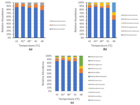 Overall, the number of methanogens decreased sharply when the temperature was shifted from 42 °C to 45 °C, as shown in Figure 5. Methanosaeta was the most dominant methanogenic archaea that existed during incubation at 42 °C, shifted up to 45 °C, subsequently shifted up to 48 °C, and also abundant during incubation atcontrolled temperatures of 45 °C and 48 °C. This result implied that Methanosaeta is a thermotolerant methanogen. The relative abundances of methanogens at the order level at various temperatures are shown in Figure 6a. The composition of methanogens in both shifted-up temperature and controlled temperature conditions was dominated by the orders Methanobacteriales, Methanomicrobiales, and Methanosarcinales. Among the three methanogens, Methanosarcinales was the most abundant (86.89% at 42 °C, 88.84% at shifted-up 45 °C, 59.14% at shifted-up 48 °C, 85.56% at controlled 45 °C, and 78.54% at controlled 48 °C).