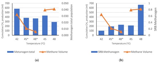 Compared to the other types of microorganisms, methanogenic archaea were shown to have the least portion of the population among the microbial communities. The decrease in the methanogen population accelerated faster in shifted-up temperature conditions than in controlled temperature conditions. However, the number of methanogen populations is unlikely to affect CH4 production. The cumulative CH4 production decreased along with the decline in the methanogen:total population (M·TP−1) ratio during the shifted-up temperature period. This result contradicts the outcome of the controlled temperature, in which the cumulative CH4 production increased conspicuously despite the fluctuation in the M·TP−1 ratio (Figure 8a). To date, no particular ratio has been found to be effective in understanding the influence of the microbial ratio (the existence of a particular microorganism) on biogas production. The closest ratio was that of sulphate-reducing bacteria (SRB) to methanogens (SRB·M−1). Previous research has stated that the existence of SRBs in the AD process may inhibit CH4 production as it would compete with methanogens for convenient H2, acetate, propionate, and butyrate []. From the shifted-up temperature experiment, the SRB·M−1 ratio showed harmony with the statement of previous research. The higher the SRB·M−1 ratio, the lower the CH4 production as the SRB emulated the methanogens in consuming available H2 (Figure 8b).