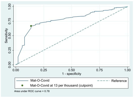 The overall predictivity was good with an area under the curve of 0.78 (Figure 1). The optimal threshold was 13 per thousand using Youden’s J statistic, with a sensitivity of 0.67, a specificity of 0.87, a low negative predictive value (0.11) and a high positive predictive value (0.99). Both positive and negative likelihood ratios were significant: 4.9 [2.4–6.4] and 0.4 [0.3–0.4], respectively. The association using 13 per thousand (n = 735, 64.5%) was still significant: the Mat-O-Covid odds ratio was 11.5 [5.1–26.0] (p < 0.0001).