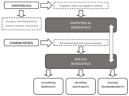 | From individual to social resilience | [58,59,60,64,65,66,67,68] |