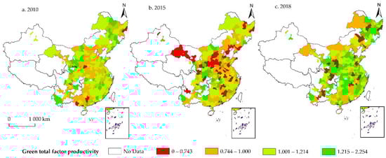 Comparing the three maps (as shown in Figure 1), we can see that the number of red and orange areas on the map increased from 2010 to 2015, reflecting a reduction in the level of green total factor productivity in China’s cities, which is consistent with Xia and Xu [37]. This is due to the “after-effects” of China’s four-trillion investment plan in 2008 to stabilize the economy in response to the US’s subprime mortgage crisis that became gradually apparent between 2010 and 2015. The investment plan was effective in stimulating economic growth, but the huge amount of capital generated was largely invested in heavy industries such as steel and coal, and mining, which led to an increase in problems such as overcapacity and environmental pollution, seriously affecting the quality of China’s economic development.