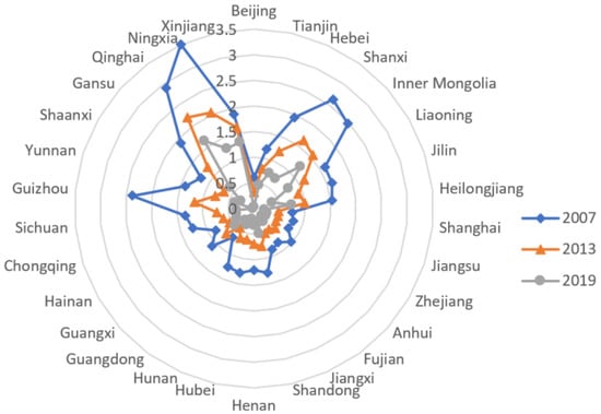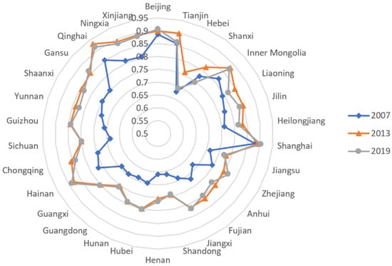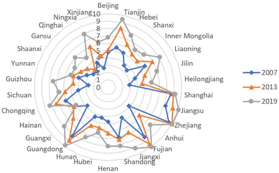 Considering the fact that the current version of Fan’s China Marketization Index—Annual Report on the Relative Process of Marketization by Regions has adjusted the measurement base period compared to the 2011 version, as a result, the financial marketization index is not produced in the middle of the year. Referring to the method of Zhong et al., this paper applied the deflator method and interpolation method to the data. Finally, the paper gathered sample data for the paper’s primary explanatory variable, the financial marketization index. The radar chart in Figure 2 is the spatial distribution of China’s provincial average financial marketization index in 2007, 2013, and 2019. It shows that there was a general rise in financial market processes over the reporting period, but there was a lot of variation between regions.