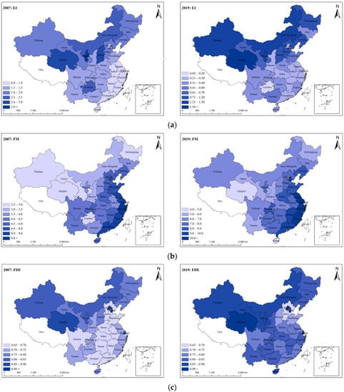 Figure 4 depicts the spatiotemporal distribution of the core variables in 2007 and 2019 based on the preceding measurement and analysis of the key explanatory and explained variables.