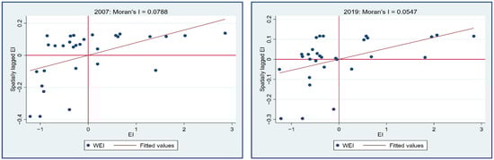 Based on the economic spatial weight matrix, the global Moran indices of regional energy intensity (EI), financial marketability index (FM), and fiscal decentralization index (FDE) all passed the 1% significance test in the reporting period, indicating that all three were able to reject the original hypothesis, which means there was no spatial correlation at the 1% significance level for each year during the period 2007–2019. Therefore, there was a significant spatial correlation between the explained variables and the core explanatory variable. Figure 5 reports the overall Moran index of regional energy intensity (EI) and its p-value level for the period 2007–2019; Figure 6 shows the annual Moran scatter plots of regional energy intensity (EI) for the years 2007 to 2019. Both Figure 5 and Figure 6 justify the reasonability of the spatial econometric model set up in this paper under the economic spatial weight matrix.