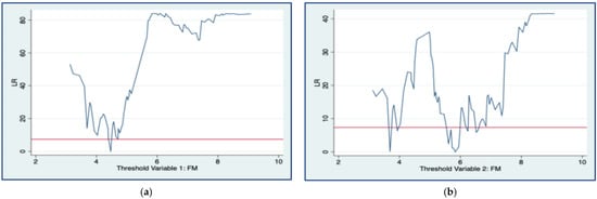 Figure 7 shows the results of the LR statistic, where Figure 7a shows the LR statistic for a model with a single threshold and Figure 7b shows the LR statistic for a model with a double threshold. The curves in the figure are the LR values. Additionally, the dashed line is the critical value of the LR statistic at a 5% significance level. The lowest value of the LR curve in the figure represents the LR value of the threshold financial marketability level (FM). The critical value is considered to be true when the LR value is lower than the critical value of the LR statistic. The results indicate that both the LR value for the single threshold and the LR value for the double threshold of FM are below the critical value. Therefore, the threshold is true.