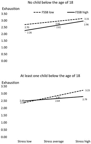 All path coefficients of the manifest path analysis are reported in Table 4. The experience of frequent exhaustion was linked to perceiving little FSSB and to frequent experiences of stress at work (Table 4). Work–family services were especially used by employees who experienced frequent exhaustion. FSSB more strongly moderated the association between stress at work and the experience of exhaustion in employees with at least one child younger than 18 years of age (Figure 2) than it did in employees with either no children or with children older than 18 years of age. In employees with at least one child younger than 18 years of age, the association between experiences of stress and exhaustion was markedly weaker in employees who perceived FSSB than in employees who did not perceive FSSB (Figure 2).