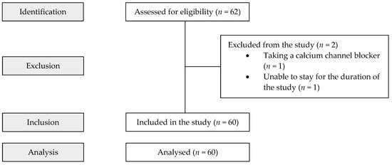Two participants were excluded from the study, one due to taking a calcium channel blocker, and one due to the inability to stay for the duration of the study, with two further participants recruited to fill the gaps; there were no further participants excluded. The total number of participants was 62, with analysis conducted on 60 participants (Figure 1). The study had institutional ethics approval from the University of Technology Sydney Human Research Ethics Committee, and all participants provided signed informed consent prior to the commencement of the study.