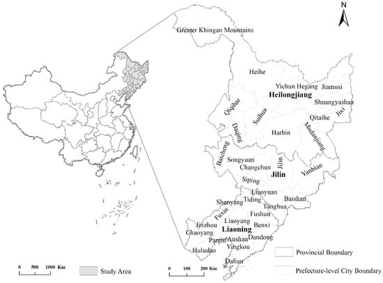 Northeast China is defined as the provinces of Liaoning, Jilin, and Heilongjiang. Liaoning province has 14 prefecture-level cities, Jilin province includes 8 prefecture-level cities and 1 autonomous prefecture, and Heilongjiang province manages 12 prefecture-level cities and 1 region (Figure 1). Due to the absence of statistics on the Daxinganling region, Suihua City, and the Yanbian Korean Autonomous Prefecture, a total of 33 prefecture-level cities are covered in this study. From 2006 to 2019, the population in the study area decreased from 97.19 million in 2006 to 95.77 million in 2019, a total decrease of 2.14 million and a population growth rate of −2.19%. Heilongjiang province contracted the most, with a population growth rate of −5.14%, while Liaoning and Jilin provinces experienced population growth rates of 0.05% and −2.20%, respectively. Yichun, Qitaihe, Jixi, Hegang, and Baishan experienced the most severe contraction, losing more than 10% of their populations. In research comparing the carbon emissions of cities in northeast China and the Yangtze River Delta, it was found that the rapidly shrinking group showed a continuous increase in CO2 emissions and a rising trend in their carbon intensity, and that the shrinking cities in northeast China have deviated from the development of a low carbon economy [].