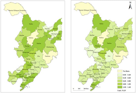 CEE shows significant polarization in the cities in northeast China, most likely due to the different levels of urban shrinkage and economic development. Dalian, Harbin, Daqing, Shenyang, and Changchun have high CEEs, and as the most economically developed cities in the northeast, they also have the lowest urban shrinkage. In contrast, a large number of the cities shrinking the most had lower CEEs, and it is notable that the small and medium-sized cities in the Harbin–Changchun and Shenyang–Dalian agglomerations (e.g., Jilin, Siping, and Songyuan) did not benefit from the agglomeration effect, but were instead affected by the siphoning effect of the central cities, which increased their shrinkage. This shows that the spatial pattern of the division of labor and cooperation among the urban agglomerations in the northeast has not yet been formed, and the lack of coordination in planning the spatial layout of productivity has led to a conspicuous problem of duplication and an inefficient use of facilities.