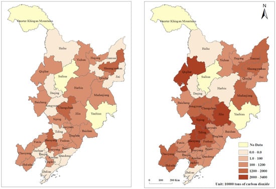 ODIAC first introduced a combination of night-time lighting data and point source data from power plants to produce spatially gridded data on global fossil fuel CO2 emissions. To date, ODIAC has published several editions, such as ODIAC 2013a, ODIAC 2016, ODIAC 2018, and the latest, ODIAC 2020b. This paper uses the latest version ODIAC 2020b, which does not include international air and maritime carbon emissions and is monthly raster data with a spatial resolution of 1000 m []. The statistical results show that ODIAC 2020b can be used to effectively map the CO2 emissions of each prefecture-level city in the three northeastern provinces. Based on this dataset, we extracted spatially gridded data of carbon emissions in the northeast region from 2006 to 2019, synthesized them into annual data, and transformed them into the commonly used unit of CO2 measurement in China.