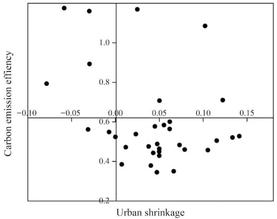 We analyzed the relationship between urban shrinkage and carbon dioxide emission efficiency by using quadrant plots (Figure 5) and box plots (Figure 6). The intersection of the mean CEE (vertical axis) and urban shrinkage 0 (horizontal axis) of a sample of 33 cities in 2019 was taken as the coordinate origin to divide the four quadrants, the CEE and urban shrinkage of the study sample were compared and analyzed using scatter plots, and the spatial distribution of CEE was plotted to further analyze and summarize the spatial distribution characteristics of urban shrinkage and CEE.