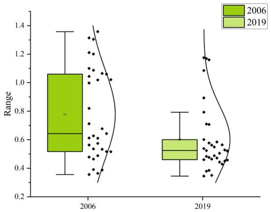 Almost 70% of the cities are in the fourth quadrant, being contracting low-efficiency cities, and the vast majority of these are smaller than the medium-sized border cities. Only Harbin, Heihe, Jiamusi, and Jixi are contracting high-efficiency cities, but these four cities, with the exception of Harbin, continue to experience a steady decline in CEE. Dalian, Daqing, Changchun, and Shenyang are growth-oriented high-efficiency cities that, with the exception of Changchun, have also experienced a continuous decline in CEE. The box plot shows that the CEE data not only reflect an overall decrease, but also reveal that more than 75% of the data is concentrated in a much lower CEE range (0.4–0.6) compared with 2006 (0.5–1.1).