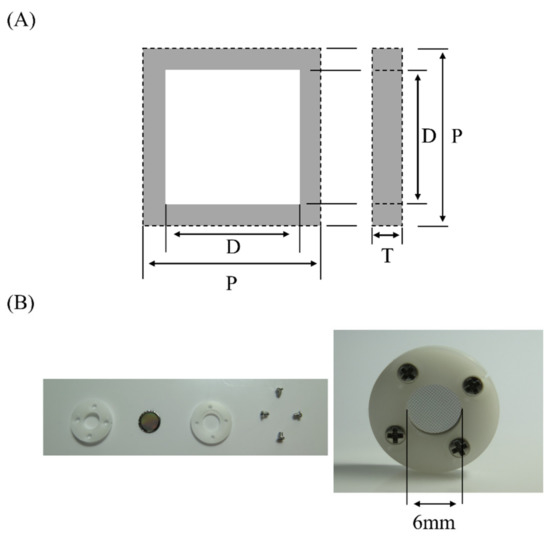 Figure 1A and Table 1 show the dimensions of single unit cells of three types of MMDs. The MMDs were made from nickel and were manufactured using the electroforming method. The MMDs were washed three times with 99.5% ethanol and pure water. After complete drying, the MMDs were irradiated with excimer light (wavelength: 172 nm) generated by an Excimer Photon Source Power Supply (Ushio Inc., Tokyo, Japan) filled with N2 gas. Each MMD was fixed in a polyacetal cover with an opening 6 mm in diameter (Figure 1B).