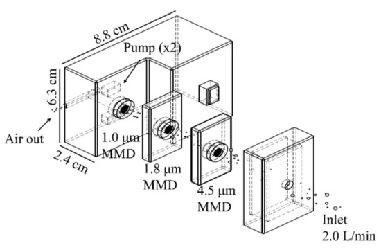 Schematic diagram showing the setup of the suction devices using stacked MMD sensors to capture aerosol particles according to size. A low-flow-rate air suction device used 4.5 µm, 1.8 µm, and 1.0 µm MMDs for collection of PM10, PM2.5, and PM1.0, respectively.