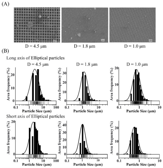 The surfaces of the MMDs were evaluated by scanning electron microscopy (SEM; S-3400N, Hitachi High-Tech Co., Tokyo, Japan). Four SEM images of each MMD were evaluated and the contour shapes of the particles were determined using ImageJ/Fiji image analysis software. Distribution graphs of particle size indicated by the long-axis diameter were generated using OriginPro (Version 2021b, OriginLab Corporation, Northampton, MA, USA).