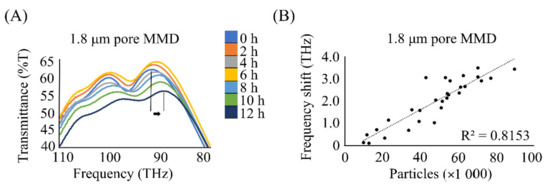(A) Spectral changes over time for the 1.8 μm MMD, showing a shift of −3.15 THz after collecting aerosol particles for 12 h. (B) The regression line of particle number vs. frequency shift for particles captured by the 1.8 μm MMD (R2, 0.8153).