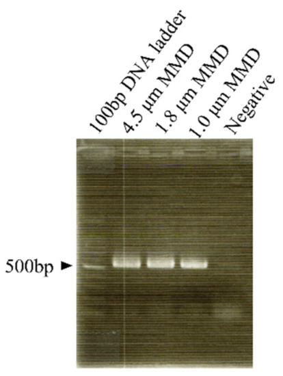 Stacking MMDs with pore sizes of 4.5 μm, 1.8 μm, and 1 μm resulted in the fractionation of particles with average sizes of 5.39 ± 4.9 μm, 1.4 ± 1.4 μm, and 0.97 ± 0.49 μm, respectively, indicating the effectiveness of size fractionation by MMDs. The PCR amplification of bacterial 16S rDNA from these fractionated aerosol particles revealed the presence of intrinsic bacterial flora in each aerosol fraction.