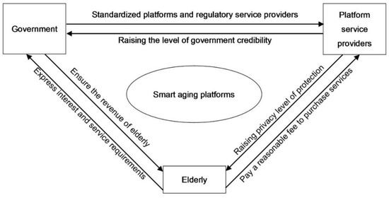 Given the long-term nature and ongoing nature of privacy protection [34,35], the information asymmetry between older people, platform providers, and the government, and the uncertainty about the effectiveness of regulation, the game behavior of the three parties is characterized by limited rationality. It is difficult for game players to seek the ideal strategy under this characteristic, but they must seek the optimal option by replicating dynamic processes, such as learning, in several games [36]. Therefore, the elderly, the platform service provider, and the government are defined as the three parties of the game, and the subject relationship is shown in Figure 1.