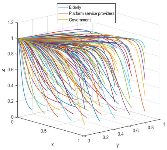 When , and , is the asymptotic stability point and ESS is non-participation, low-quality protection, low input regulation. If is similar to the stability analysis of , the platform service providers should increase the level of privacy protection for public users while also expanding the service benefits obtained by the elderly, to encourage the elderly to participate in supervising the smart aging platform. If , i.e., the investment cost of low-quality protection is less than that of high-quality protection, the platform service providers will choose low-quality protection. To enable the platform service providers to choose the strategy of high-quality protection, the input cost should be expanded or reduced , so that the difference between the input cost of the service providers when choosing the two strategies is not significant as far as possible. When we look at , we can see that if the government actions high input projects, we obtain high input results. If the cost of regulation plus the subsidies granted to the platform service providers exceeds the penalty earned from the platform, the government will opt for low input regulation, which is exactly what the government expects.