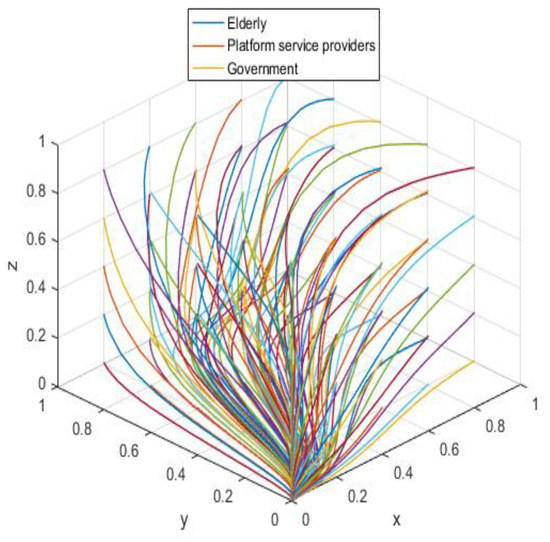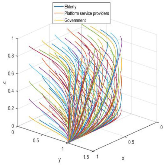The usage of an aging app by elderly families can solve difficulties such as mobility issues, medical services for the elderly, and emergency support, all of which are important for the healthy development of aged services. The platform service providers’ high-quality protection of the privacy of elderly families and their families may enhance their willingness to participate in the supervision of the smart aging platforms. The government may adopt a free-riding mentality to save money. With the improvement of platform service providers’ awareness of privacy protection, they actively adopt the strategy of high-quality protection. To lower the expense of regulation, the government can pick low input regulation. We can select as the optimal asymptotic stabilization point, i.e., (participation, high-quality protection, low input regulation) as the best ESS, because only the three eigenvalues are negative. The three-party game space is: