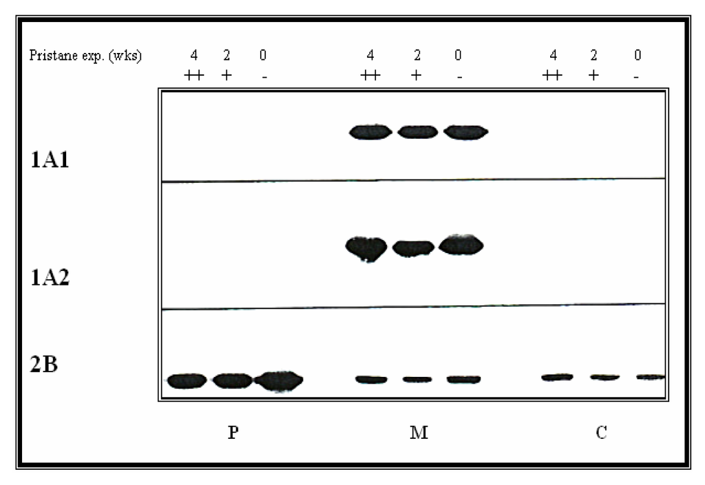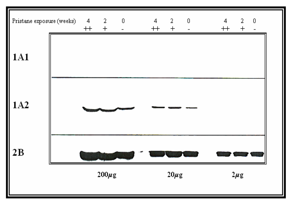 Within hepatic samples from untreated rats (Group 1), no CYP1A1 was detected, although basal levels of CYP1A2 and CYP2B proteins (note two bands since our MAb probe specific for CYP2B detects both the CYP2B1 and the CYP2B2 isozymes) were apparent. However, pristane treatment (Group 2) affected the expression of the latter mentioned CYPs without affecting CYP1A1 (see Fig. 1). This effect was best demonstrated with 20μg and 2μg of microsomal protein for CYP1A2 and CYP2B, respectively. Based on the densitometric scans of these profiles pristane elicited 1.7 and 1.4 fold increases in CYP1A2 and 1.6 and 1.5 fold increases in CYP2B after 2 and 4 weeks post pristane treatment, respectively.