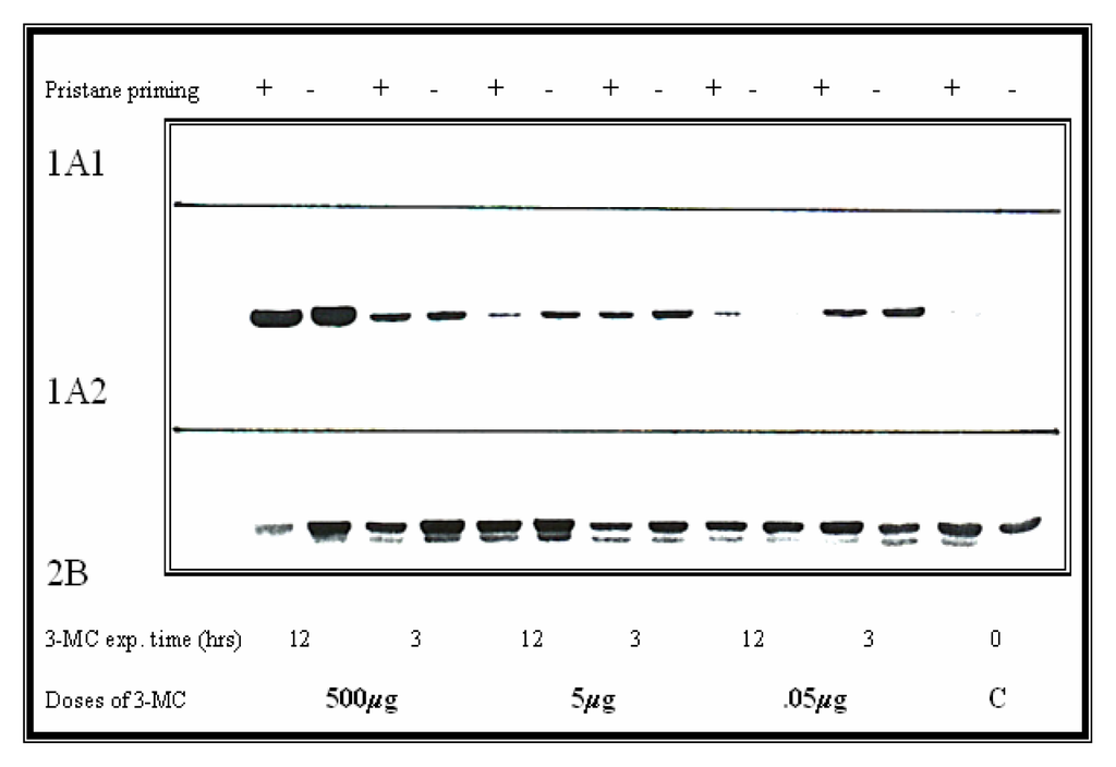 The effects of carcinogenic doses of 3-MC (within the animal model employed) on hepatic CYPs were also examined. A representative immunoblot depicting the effects of 3-MC, 3 and 12hr post injection into the PP of either unprimed (Group 3) or pristane primed (Group 4) rats are depicted in Fig. 3. Note that the amount of LIV microsomal protein was 100 fold more than that employed in Fig. 2; hence the basis for detection of CYP1A2. Again, CYP1A1 levels were below detectable levels. Also, as previously observed, pristane treatment led to increased expression over basal levels of CYP2B. However, increased expression over constitutive levels of CYP1A2 in pristane treated rats (without 3-MC exposure) was detected by employing this amount of protein. In addition, increased amounts over untreated control levels of CYP1A2 were observed after 3-MC exposure. Unexpectedly, less CYP1A2 appeared to be present in the LIV 3hr after PP injection with 500μg than with 0.05 or 5μg of 3-MC. Upon co-treatment with pristane, CYP1A2 levels (when compared to hepatic levels at the respective times from rats not treated withpristane): 1) decreased after 3hr and increased after 12hr at the 0.05μg 3-MC treatment, 2) decreased after 3 and 12hr at the 5μg 3-MC treatment, and 3) increased after 3hr, but decreased after 12hr at the 500μg 3-MC treatment. With respect to CYP2B, pristane co-treatment led to levels which were increased after 3 and 12hr at the 0.05μg 3-MC treatment, but decreased after 3 and 12hr at the 5μg and 500μg 3-MC treatments.