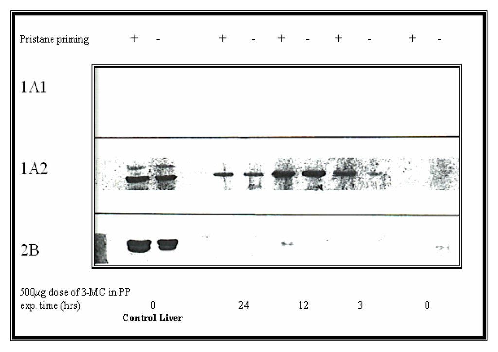 Membrane perturbation by pristane possibly leads to alterations in regulation of many different cellular products including cytochrome P450 (P450) isoforms, which are also membrane associated. Using pristane and the carcinogen 3-MC [17], which induces P450 isozymes (products of the CYP genes), we examined the effect(s) of pristane on CYP isozyme expression within the suspected target organs. Not only are CYP isozymes specifically regulated [18], they are inducible [19–30] and catalyze the biotransformation of both exogenous and endogenous compounds to highly reactive intermediates which can cause toxicity and/or carcinogenicity [25–30]. We undertook these studies in light of the fact that pristane influences CYP1A activity in a 3-methylcholanthrene (3-MC) dose dependent manner [7], leading to speculation as to whether or not tissue specific expression of CYP protein correlated with CYP1A activity in the preferential induction of lymphoid malignancies.