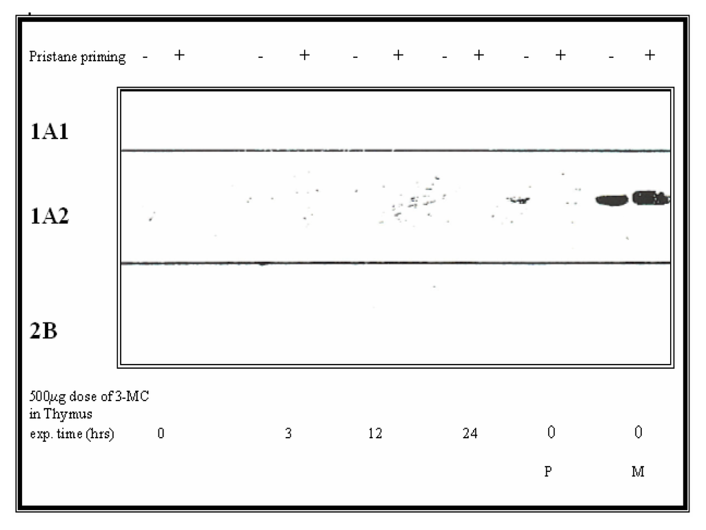 The effects of 500μg 3-MC injected into the PP, 3-MC or PB very high dose treatment on expression CYP in THY. This immunoblot was generated from thymic microsomal samples from unprimed or pristane primed (− = unprimed; + = pristane primed) rats which were either untreated (CT), carcinogenic dose 3-MC treated (3, 12 or 24 hr), very high dose PB (P) or 3-MC (M) treated. Only thymic microsomal samples were applied to the gel at a final concentration of 200μg of microsomal protein/well. The procedure for Western blot analyses is described in the Methods and Materials section. Three of the 4 duplicate gels were antibody probed and one was Coomassie blue stained.