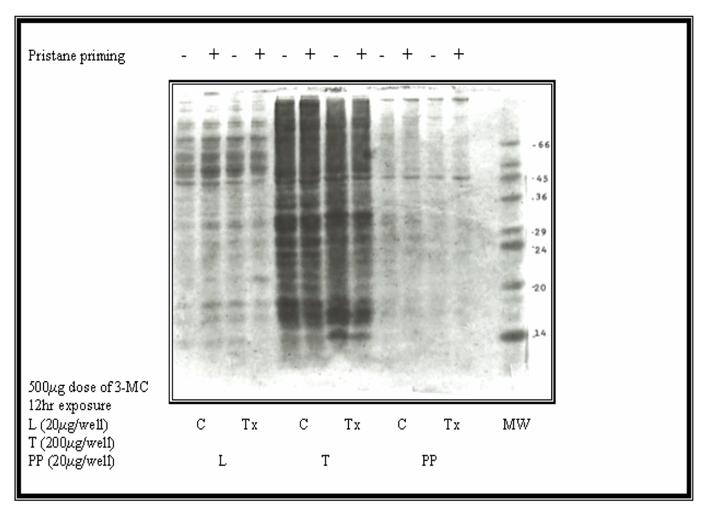 Representative Coomassie blue stained SDS-Page gel of rat Peyer’s Patches (PP), THY (T = thymus) and LIV (L = liver) microsomal proteins isolated following treatment with 3-MC (500μg dose; 12hr exposure) and with (+ = 2 wk pristine priming) or (−) without pristane. Samples were loaded at 20μg of protein/well for PP and L, or 200μg of protein/well for THY samples. Control samples (C = no 3-MC) were run in lanes next to the corresponding Tx (treatment with 500μg 3-MC directly into the PP) samples for comparison purposes as shown on the immunoblot in Fig. 7. The mobilities of molecular weight markers (MW) are indicated. Gels were electrophoresed according to the Laemmli method.