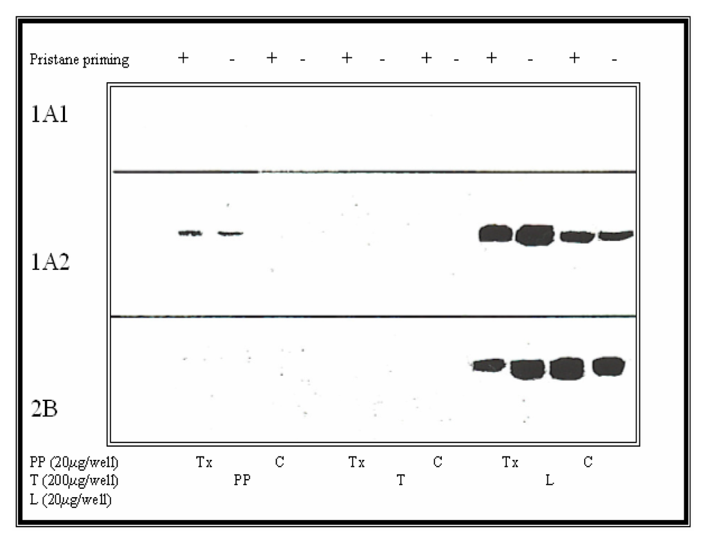 Composite immunoblot of PP, THY (T) and LIV (L) microsomal proteins from unprimed (−) or pristane primed (+) rats which were either untreated (C) or treated with 3-MC (Tx). All tissues were isolated from rats 12 hours after injection of 500μg of 3-MC into the PP. The optimized concentrations of microsomal proteins which were loaded into each of the wells of the gel are noted and the immunoblot generated was probed with MAbs specific for CYP1A1, CYP1A2 or CYP2B as indicated.