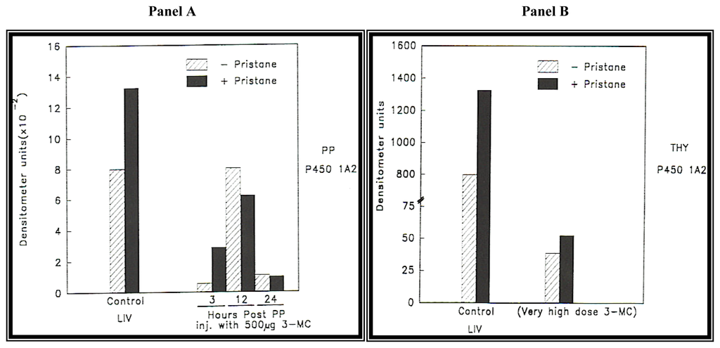 In light of the possible mode(s) of action of pristane, membrane perturbation by pristane may alter the phospholipid environment. Along these lines, it has been well established that drug-metabolizing enzymes located in the cell membranes can be affected by compounds which influence membrane structure and fluidity [23]. In other words, the functions of CYP are intimately related and highly dependent upon membrane interactions/function. Previous studies have clearly established that pristane is membrane associated [16] and elicits marked biological effects on membrane fluidity, as well as chromatin conformation [8]. Thus, the premise that pristine perturbs the plasma membrane and leads to altered expression, and/or function of the CYPs, is plausible. This may explain in part how pristane influences a diverse group of pathological processes, including carcinogenesis.