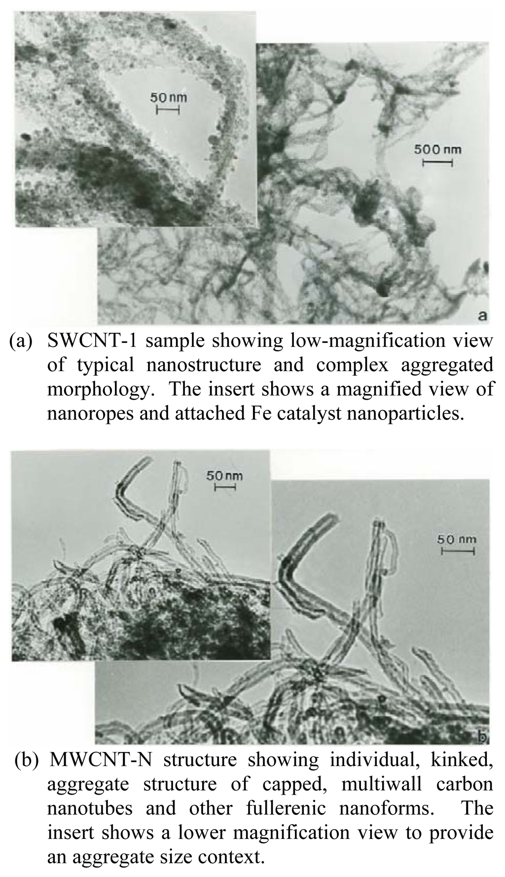 TEM bright-field images of SWCNT-1 and MWCNT-N carbon nanotube aggregates.(a) SWCNT-1 sample showing low-magnification view of typical nanostructure and complex aggregated morphology. The insert shows a magnified view of nanoropes and attached Fe catalyst nanoparticles.(b) MWCNT-N structure showing individual, kinked, aggregate structure of capped, multiwall carbon nanotubes and other fullerenic nanoforms. The insert shows a lower magnification view to provide an aggregate size context.