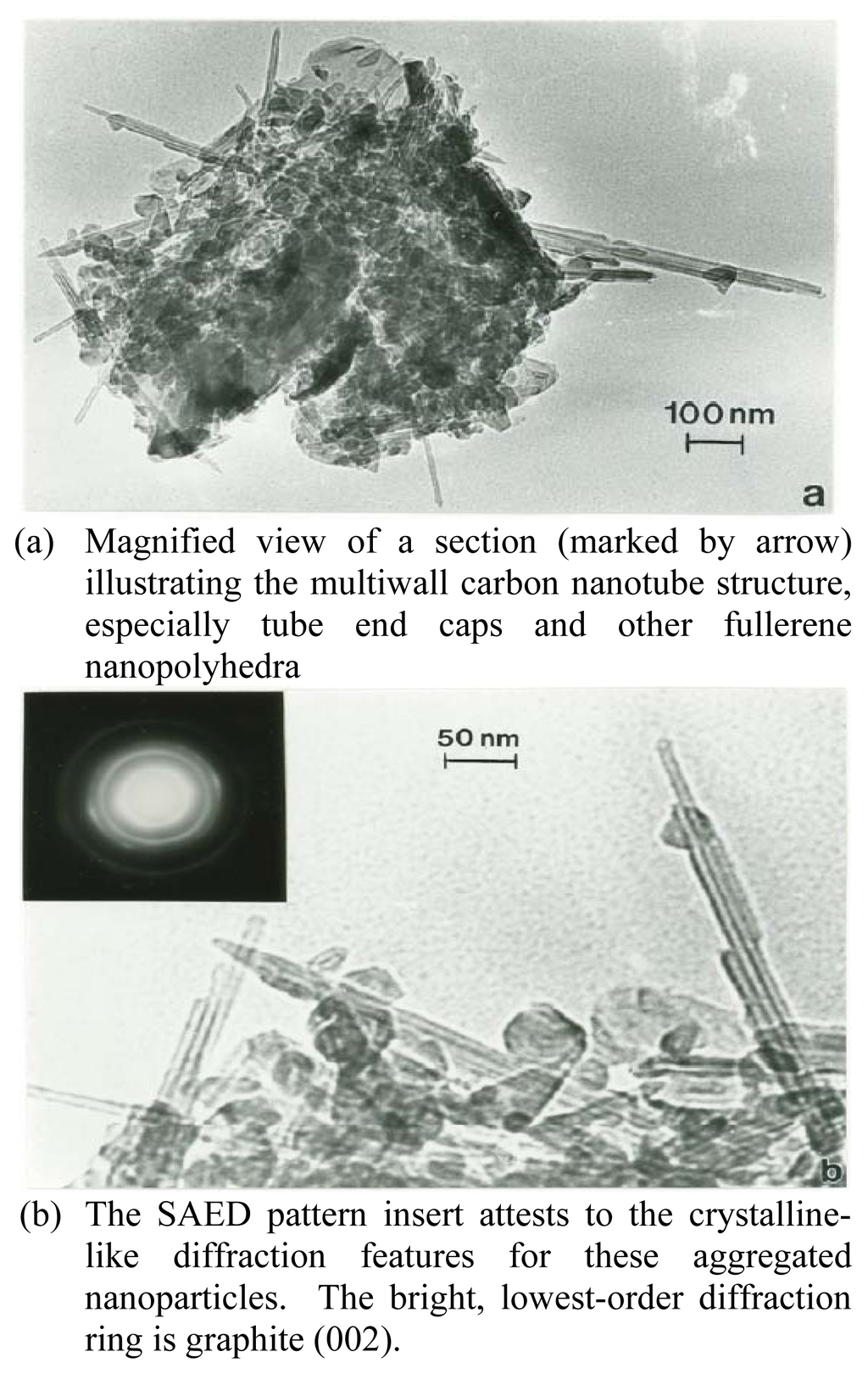 Figure 5(a) shows the BC (Vulcan XC-72) test material to be characterized by complex, branched aggregates of carbon spherules ranging in size from about 10 nm to 50 nm. The SAED pattern insert shows the same graphite diffraction rings shown in the SAED pattern insert in Figure 4(b) for aggregates of carbon nanotubes and fullerene polyhedra, but the diffraction ring intensity profiles exhibit a more diffuse amorphous-like microstructure consistent with the turbostratic, amorphous carbon and fullerene nanoparticle compositions of soots illustrated in recent high-resolution TEM studies by Grieco, et al. [30] and Vander Wal and Tomasek [31]. Correspondingly, Fig. 5(b) shows for comparison with Figure 5(a) typical diesel (truck) soot aggregate characterized by a similar, branched, fractal-like, carbon spherule aggregate; with spherule dimensions also ranging from about 10 nm to 50nm in diameter.