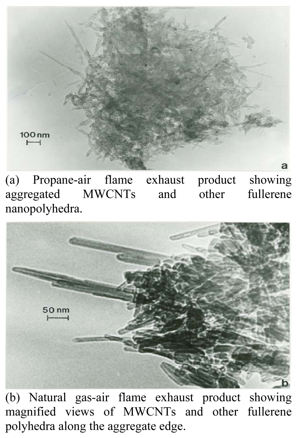 TEM bright-field images of MWCNT aggregates collected form the exhaust streams of kitchen stove-top burners by thermal precipitation.(a) Propane-air flame exhaust product showing aggregated MWCNTs and other fullerene nanopolyhedra.(b) Natural gas-air flame exhaust product showing magnified views of MWCNTs and other fullerene polyhedra along the aggregate edge.