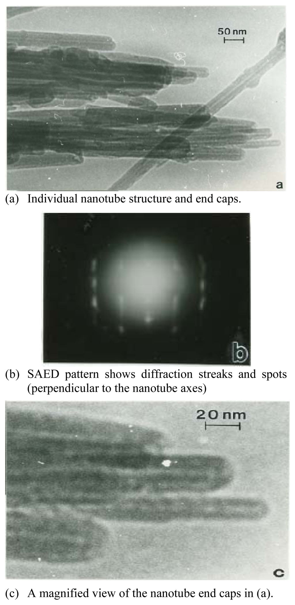 TEM bright-field images of chrysotile asbestos nanotube bundles (From Murr and Soto [22]).(a) Individual nanotube structure and end caps.(b) SAED pattern shows diffraction streaks and spots (perpendicular to the nanotube axes)(c) A magnified view of the nanotube end caps in (a).